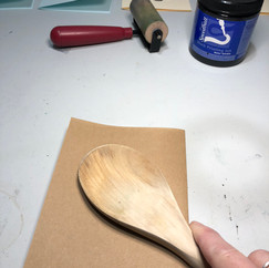 Once you're done carving, you are ready to print. If your block is small enough, you can use a stamp pad. Or, if you want the full printmaking experience you can ink up with a brayer (the printing roller). Whichever way you choose, it's always magical to see the first ink up, and print. You can use the palm of your hand to press on the paper, or you can use a wooden spoon.