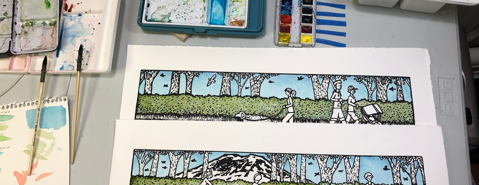 While I waited for my ink to cure, I was finalizing my Cloud block, which was scheduled to be the cover art for Olympia Art Walk Spring 2020. I was also furiously cleaning my studio to prepare for an interview with the City of Olympia. All the while my ear was to the news, I was guessing that things were going to come to a screeching halt soon, that all the prep work for Art Walk was possibly in vain. When I finally came back to paint the Maple Valley prints, sure enough, the world had gotten a lot more complicated, and my premonitions about things shutting down became reality. But painting the prints was a task I would have done from home no matter what. I painted a couple versions, and let council members in Maple Valley choose their favorite via the wonderful world of email.