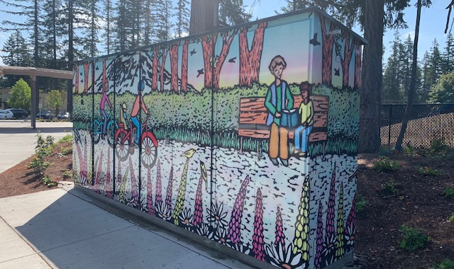 Maple Valley is a beautiful town just off Hwy 18, Southeast of Seattle. The parks and trails are a source of pride for the town, and I had the pleasure of exploring them in the autumn of 2019. The utility box that my piece was intended to cover was large; seventeen feet long, six feet tall, and three feet wide. The utility box lives in Summit Park which has playgrounds, trails, and sports fields galore! The park itself, and the fact that I've never been to a PNW town that doesn't dote on its landscape, was inspiration enough for the piece I would create. I was quite excited to start the process.